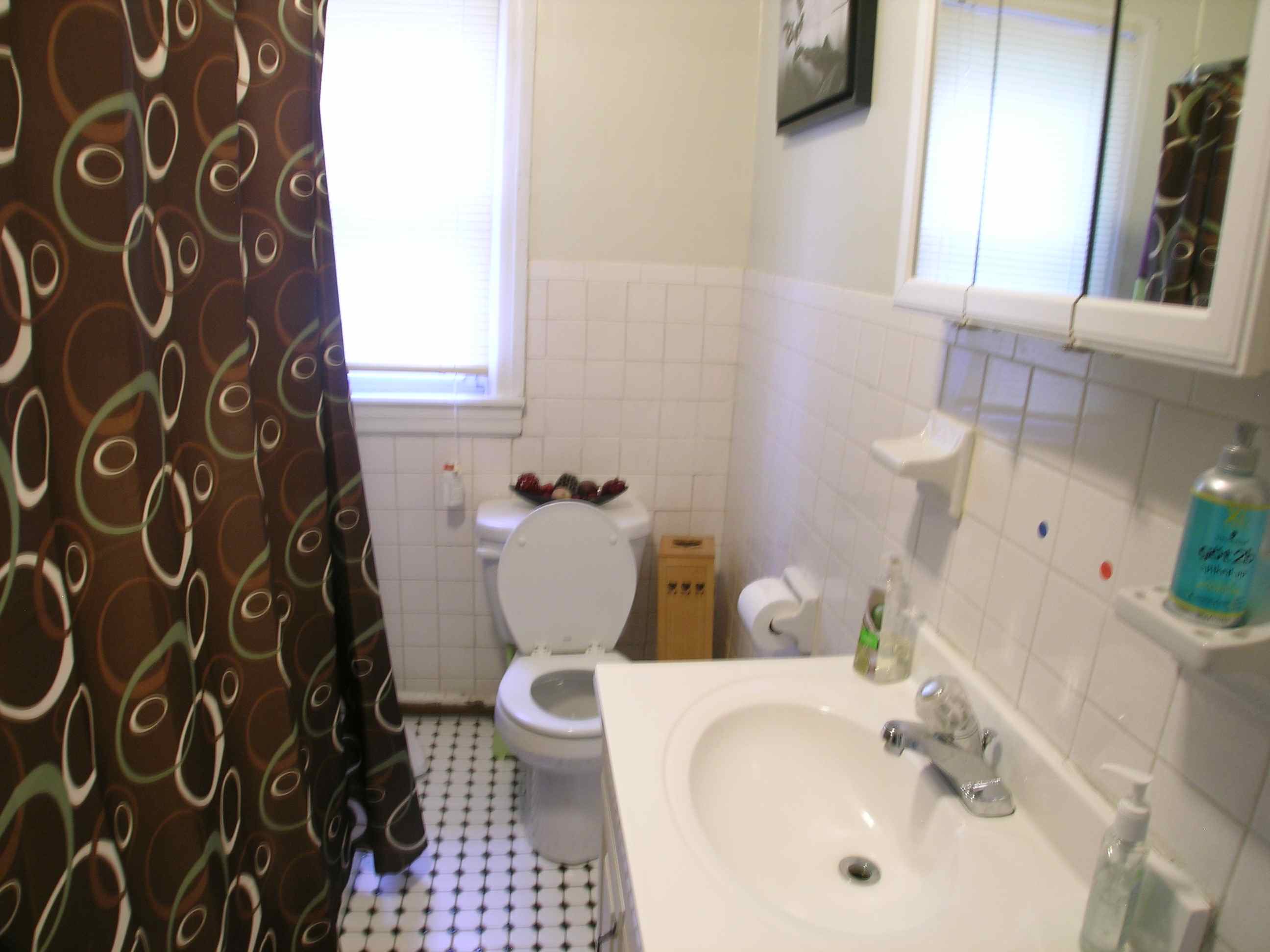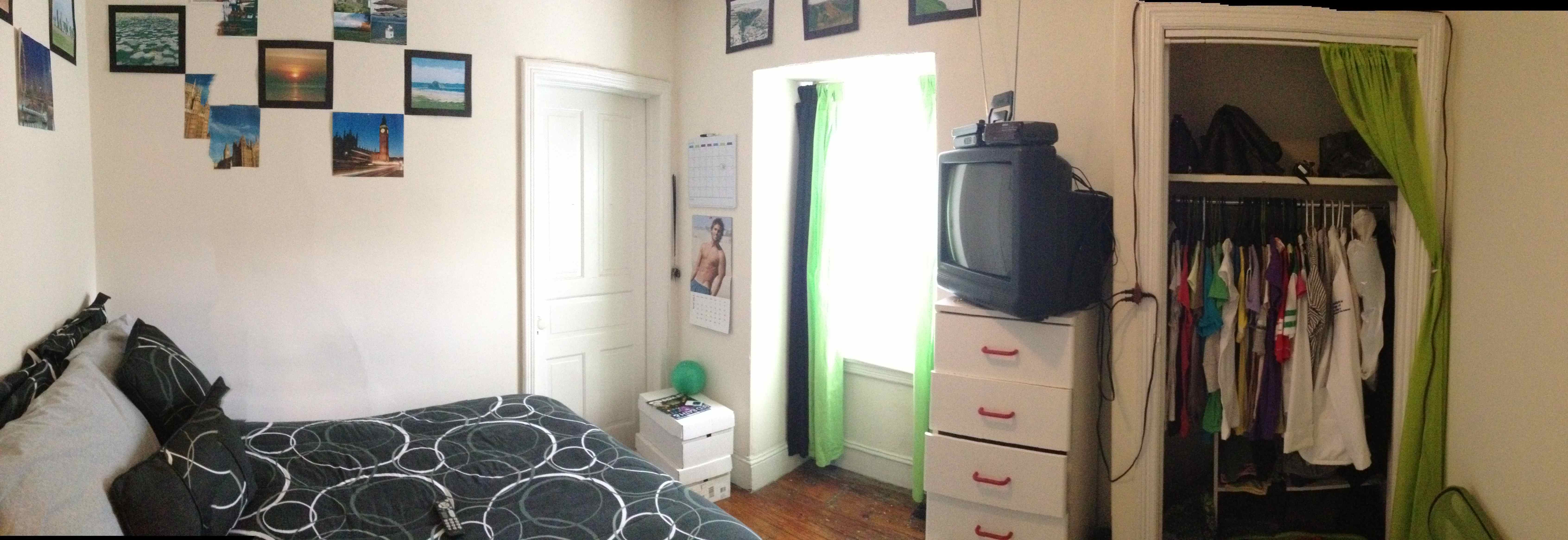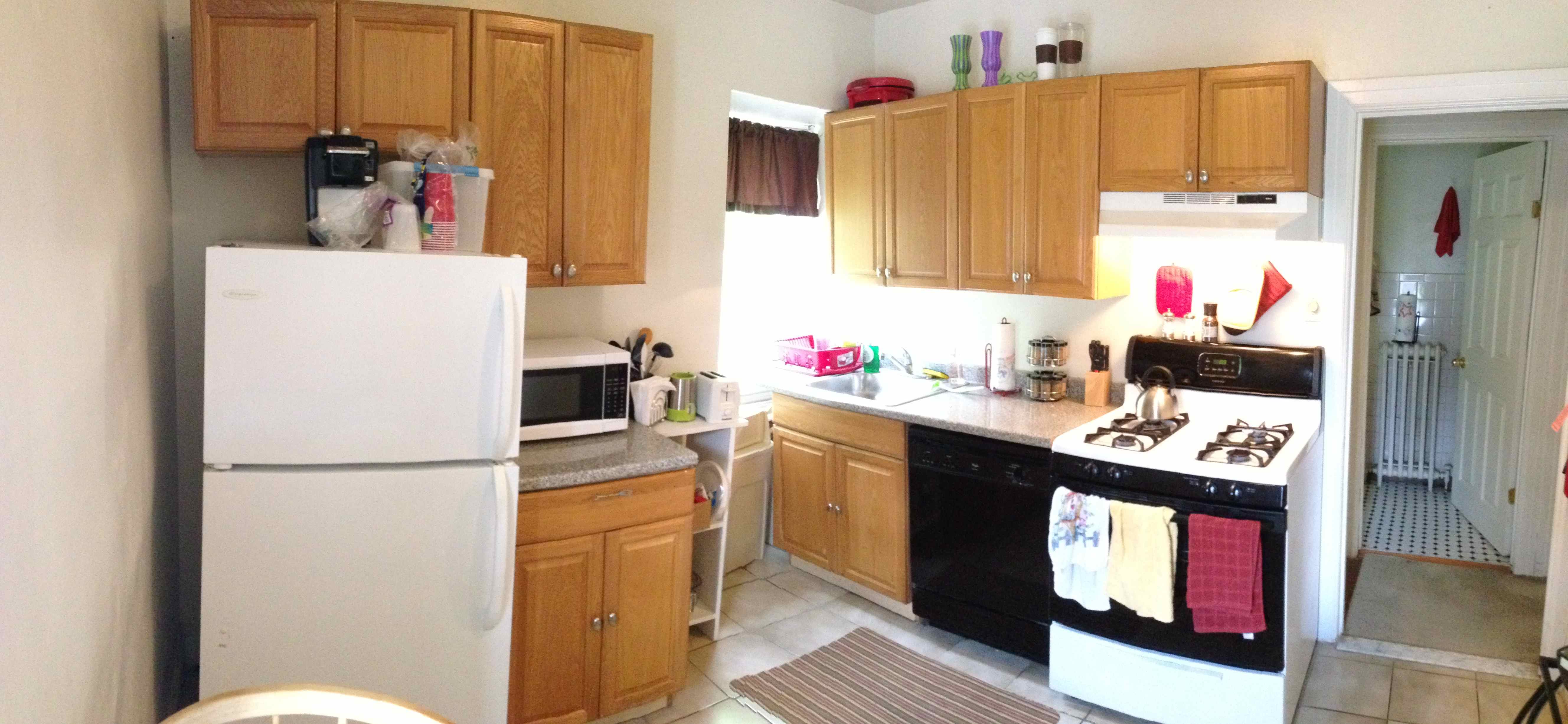 | Large, bright 3rd floor two bedroom apartment with 8 foot ceilings and hardwood floors. The large sunny living room has a closet and 4 windows facing south. The front bedroom has a closet and a window. The rear bedroom also has a closet and a window. The kitchen has a large refrigerator, dishwasher, disposal, a gas range, ceramic tiled flooring, lots of cabinet space, and two windows. The bathroom is large and has a tub with a shower, ceramic tiled flooring, a vanity, and a nice stained glass window. There is a lot of closet space in this apartment. There is a very large attic for storage as well. This apartment has central air conditioning. There is a coin-operated laundry system in the basement. |