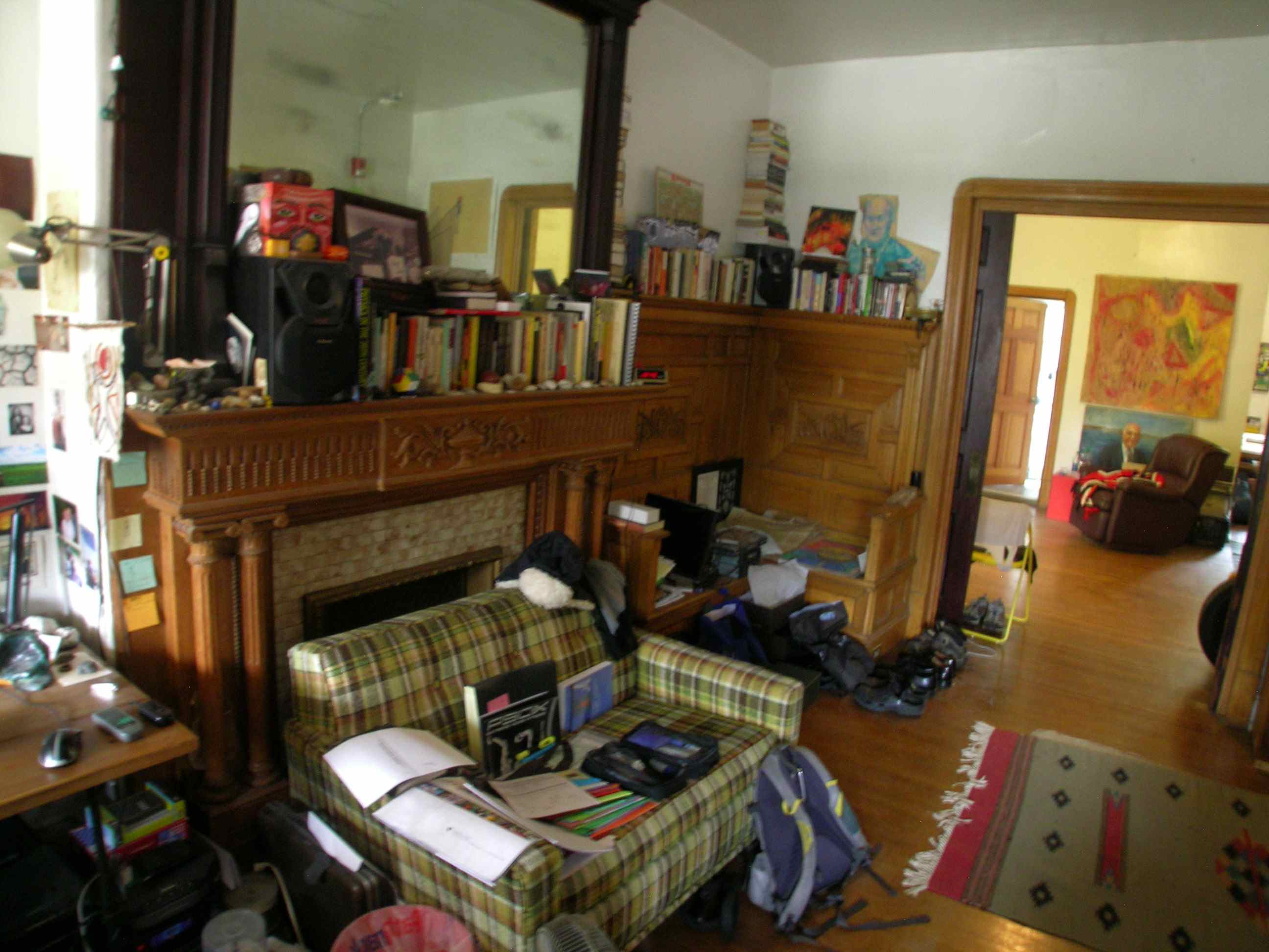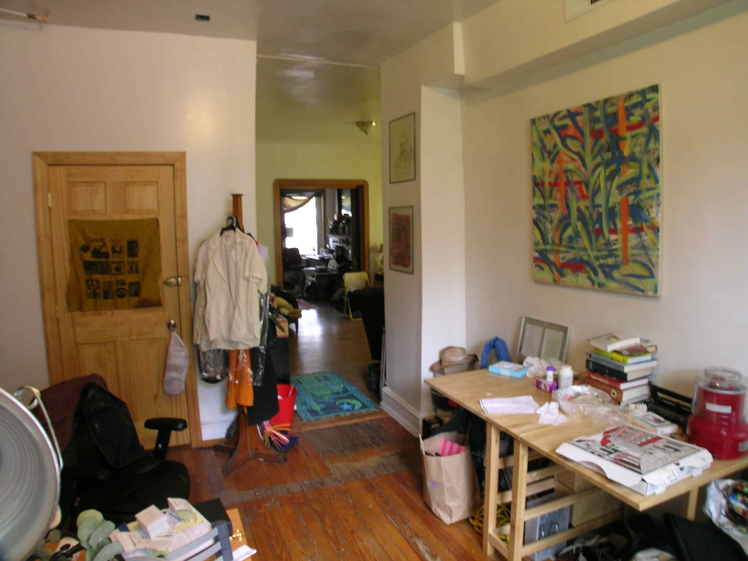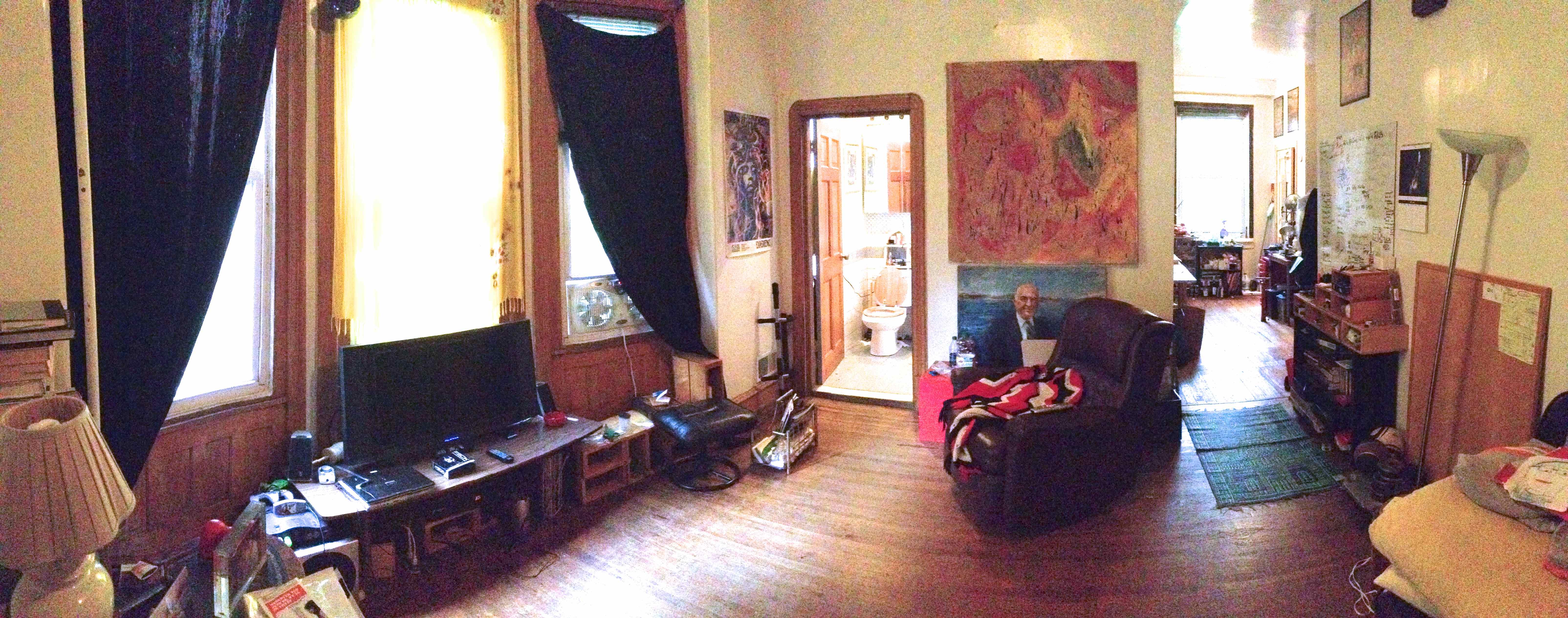 | Large first floor two bedroom apartment with 9 foot ceilings, hardwood floors, a rear patio, and all natural unpainted woodwork. The large living room has plaster cast crown moldings, a large closet, and a bay window with three windows facing west. There are pocket doors leading to the front bedroom. The front bedroom has a beautiful decorative fireplace with a huge mirror above it and an amazing carved oak built-in bench, as well as 2 windows facing south. The kitchen has a large refrigerator, dishwasher, disposal, electric range with a built in microwave/range hood, lots of cabinet space and counter top, a pantry closet, ceramic tiled flooring and a large sink overlooking a large window. There is a dining room/office with a big window, exposed brick and a built-in set of shelves next to the kitchen. The bathroom has a tub and a shower and has ceramic tiled flooring, as well as a sink, medicine cabinet, recessed lighting, and a large window. The rear bedroom