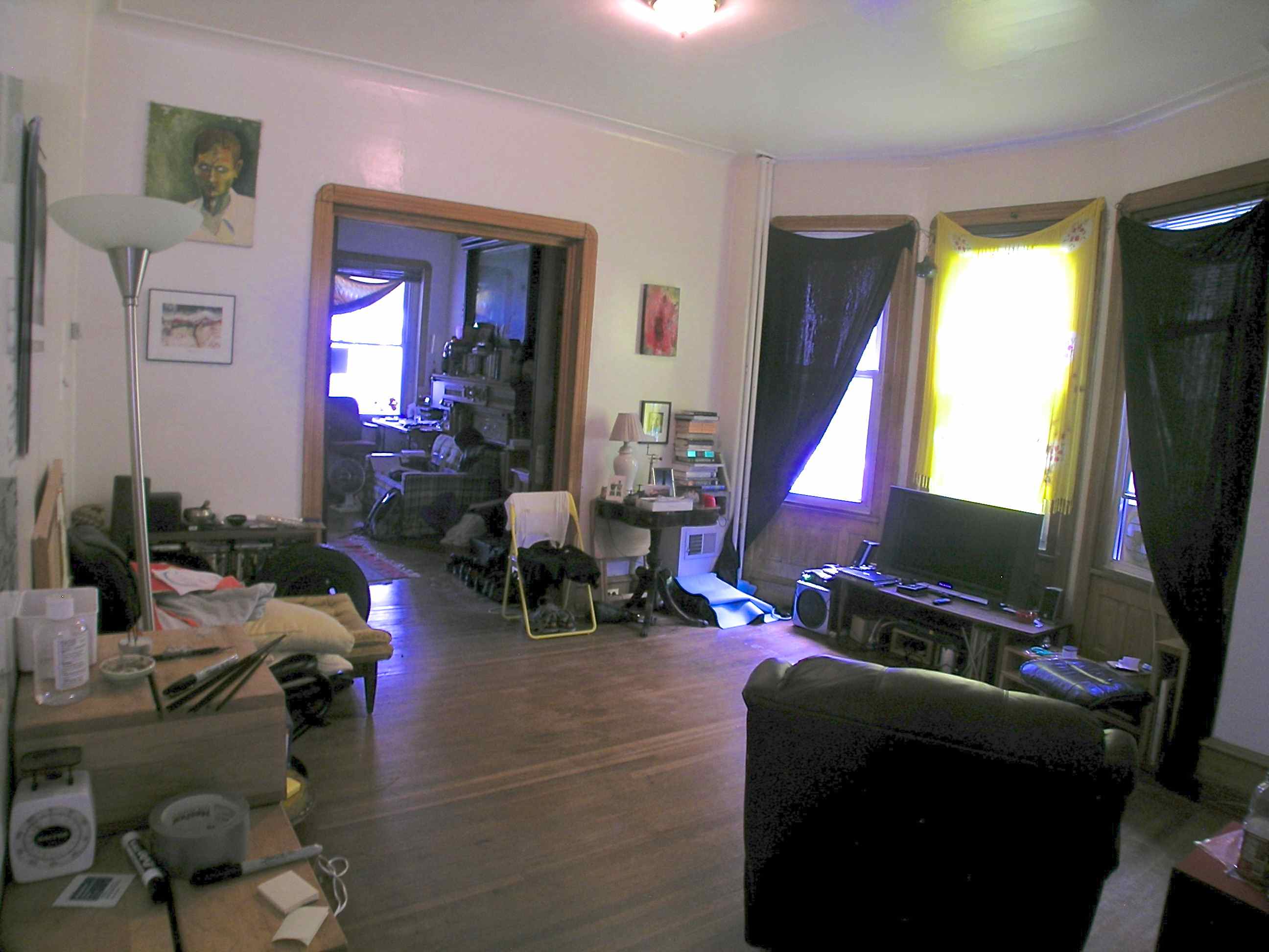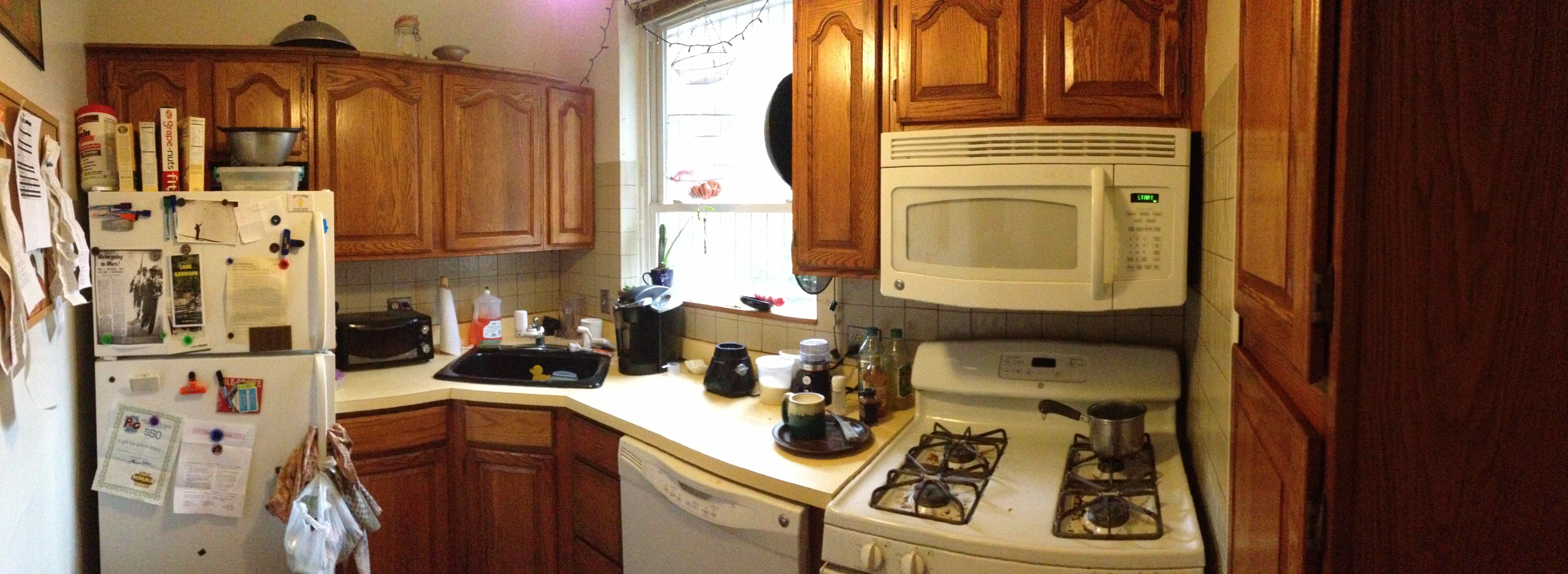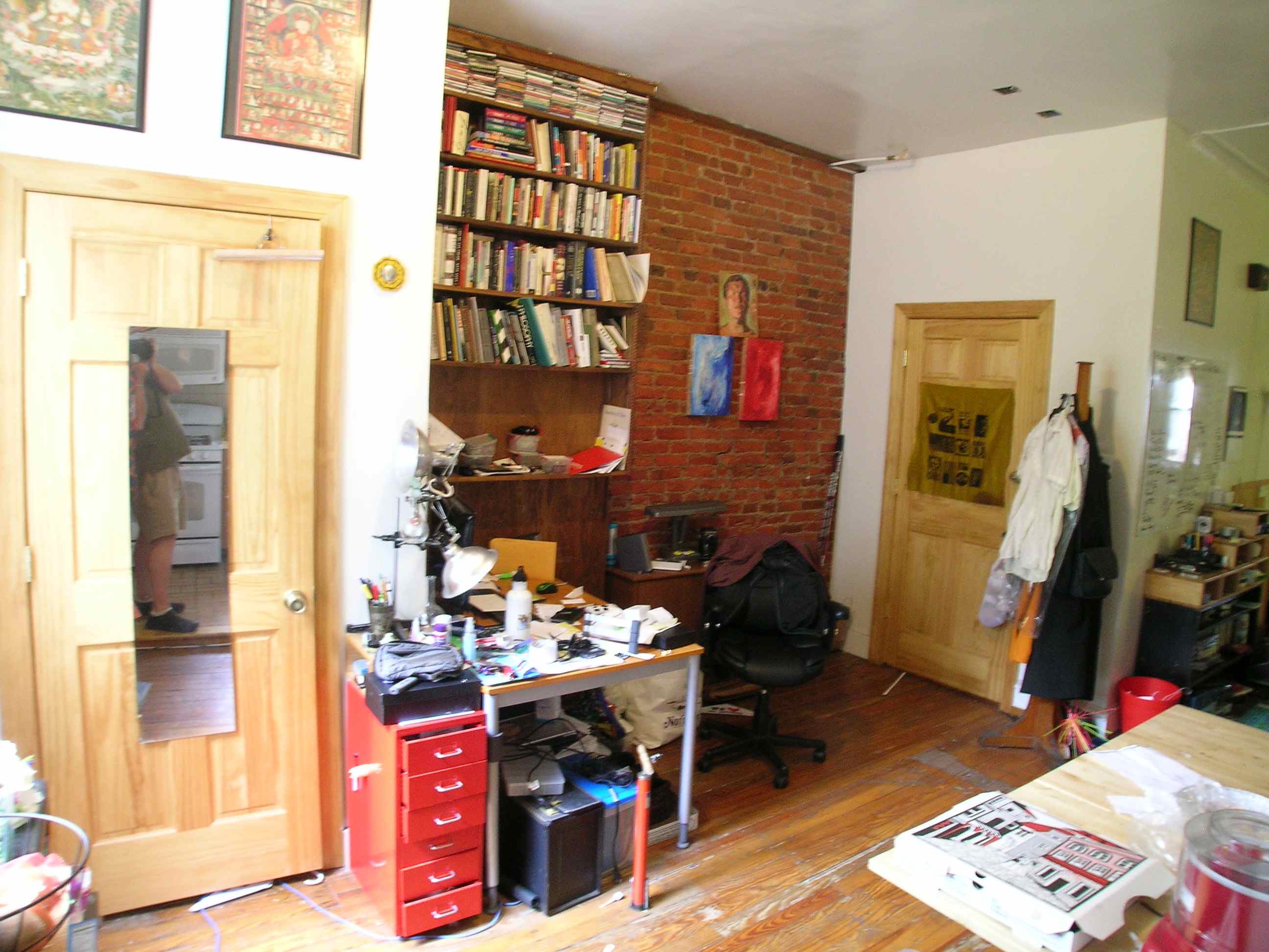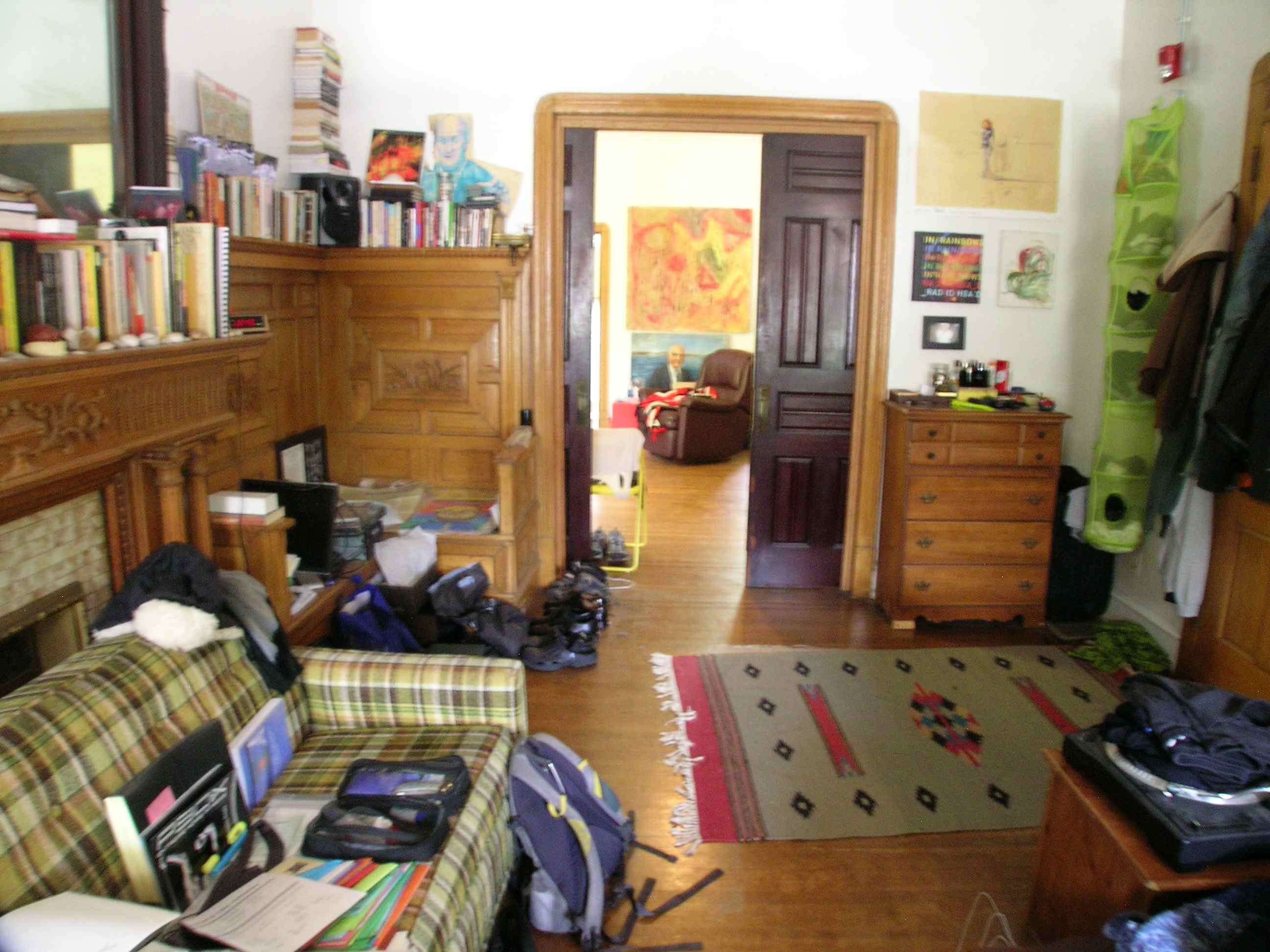 | Large first floor two bedroom apartment with 9 foot ceilings, hardwood floors, a rear patio, and all natural unpainted woodwork. The large living room has plaster cast crown moldings, a large closet, and a bay window with three windows facing west. There are pocket doors leading to the front bedroom. The front bedroom has a beautiful decorative fireplace with a huge mirror above it and an amazing carved oak built-in bench, as well as 2 windows facing south. The kitchen has a large refrigerator, dishwasher, disposal, electric range with a built in microwave/range hood, lots of cabinet space and counter top, a pantry closet, ceramic tiled flooring and a large sink overlooking a large window. There is a dining room/office with a big window, exposed brick and a built-in set of shelves next to the kitchen. The bathroom has a tub and a shower and has ceramic tiled flooring, as well as a sink, medicine cabinet, recessed lighting, and a large window. The rear bedroom