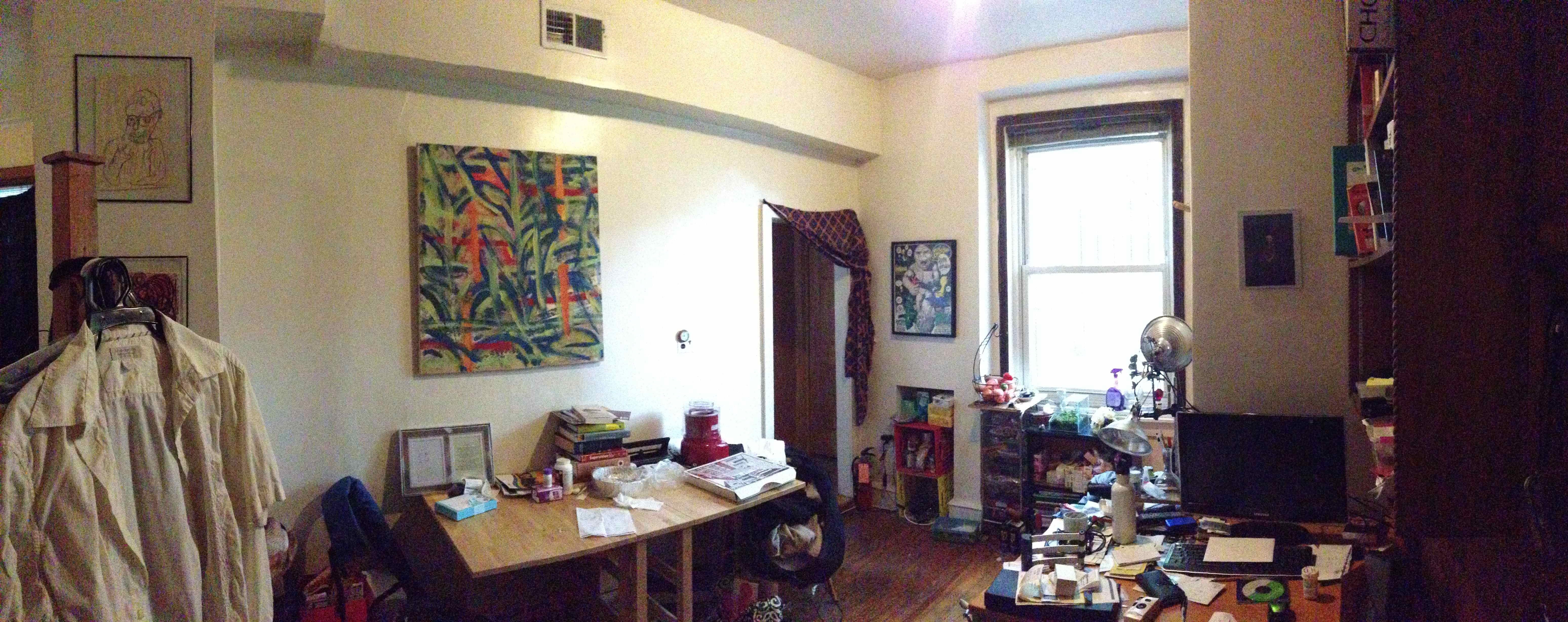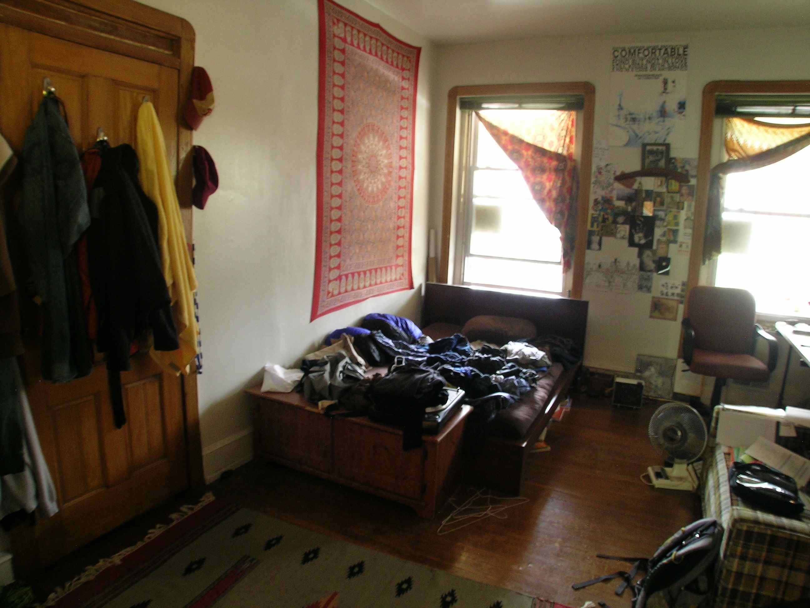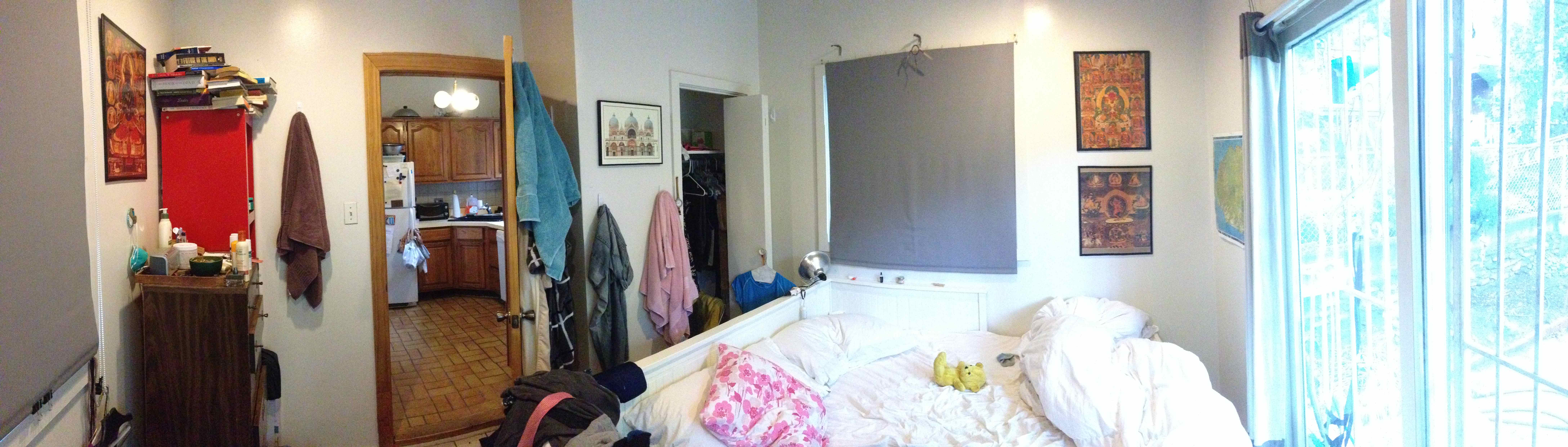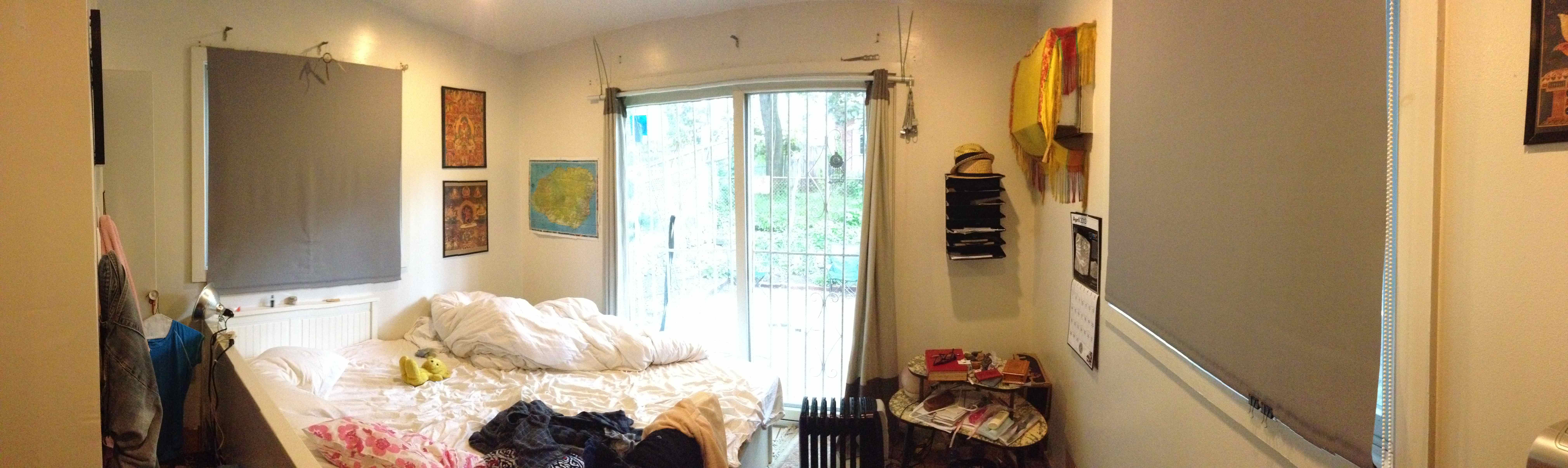 has a big closet, 2 windows, and a sliding glass door that leads to the back patio. The back patio is brick with a surrounding garden. The apartment has lots of closet space, all new windows, and central air conditioning. There is a coin-operated laundry system in the basement. |
